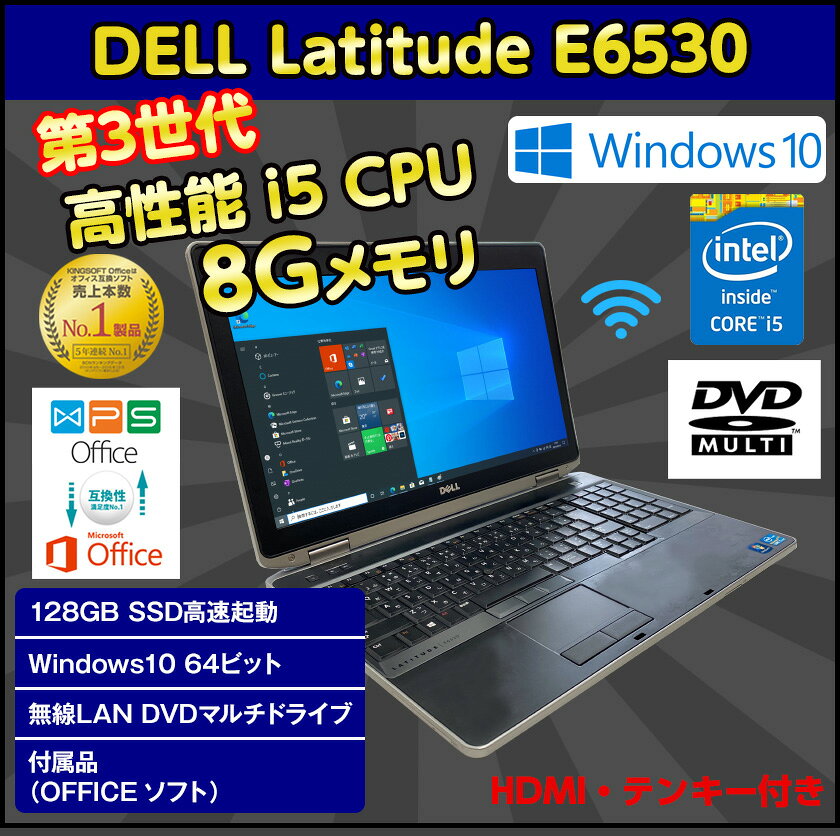 商品説明 メーカー DELL Latitude E6530 CPU 第3世代 Corei5 メモリ 8GB HDD/SSD SSD 128GB 無線LAN 内蔵また新品小型USB無線LANアダプタ付属 ドライブ DVDマルチドライブ(CD・DVD再生&書込み) 液晶サイズ/最大解析度 15.6型ワイド液晶/1600x900 ※画面が大きくて、目に優しくて、仕事もネット動画鑑賞にもおすすめ! インターフェイス USB2.0*3/HDMI*1/eSATAポート*1/SDカードスロット*1/エクスプレスカードスロット*1/スマートカードスロット*1/アナログRGB(D-Sub 15ピン)*1/マイク入力/ヘッドホン出力*1/Wi-Fiスライドボタン*1/LANポート*1 操作OS Windows10 64ビット 付属品 パソコン本体/ACアダプター/KINGSOFTライセンスカード(オフィス) インストール済みソフト WPSOffice(KINGSOFTOffice)、Google Chrome ウェブブラウザ、DVD Player リカバリ形式 なし 附属バッデリー ※付属のバッテリーは消耗品のため保証対象外となります。