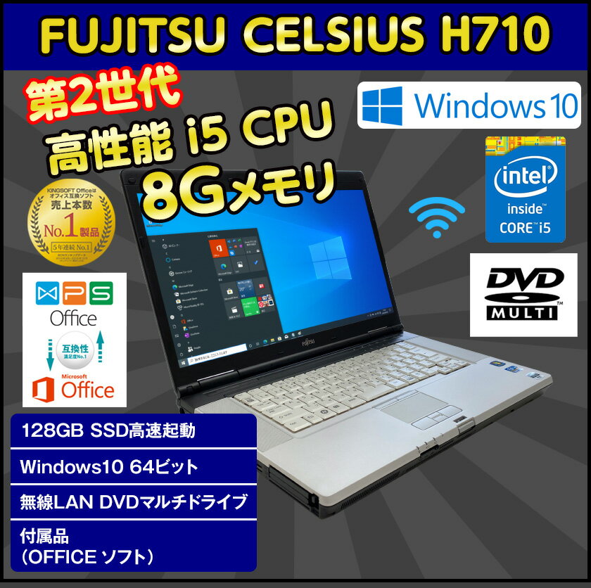 商品説明 メーカー FUJITSU CELSIUS H710 CPU 第2世代 Corei5 メモリ 8GB HDD/SSD SSD 128GB 無線LAN 内蔵また新品小型USB無線LANアダプタ付属 ドライブ DVDマルチドライブ(CD・DVD再生&書込み) 液晶サイズ/最大解析度 15.6型ワイド液晶/1600x900 ※画面が大きくて、目に優しくて、仕事もネット動画鑑賞にもおすすめ! インターフェイス USB2.0*3/USB3.0*1/DPポート*1/LANポート*1/アナログRGB(D-Sub 15ピン)*1/eSATAポート*1/マイク入力/ヘッドホン出力*1/SDカードスロット*1/PCカードスロット*1/エクスプレスカードスロット*1/スマートカードスロット*1/Wi-Fiスライドボタン*1 操作OS Windows10 64ビット 付属品 パソコン本体/ACアダプター/KINGSOFTライセンスカード(オフィス) インストール済みソフト WPSOffice(KINGSOFTOffice)、Google Chrome ウェブブラウザ、DVD Player リカバリ形式 なし 附属バッデリー ※付属のバッテリーは消耗品のため保証対象外となります。