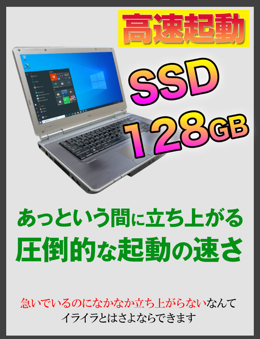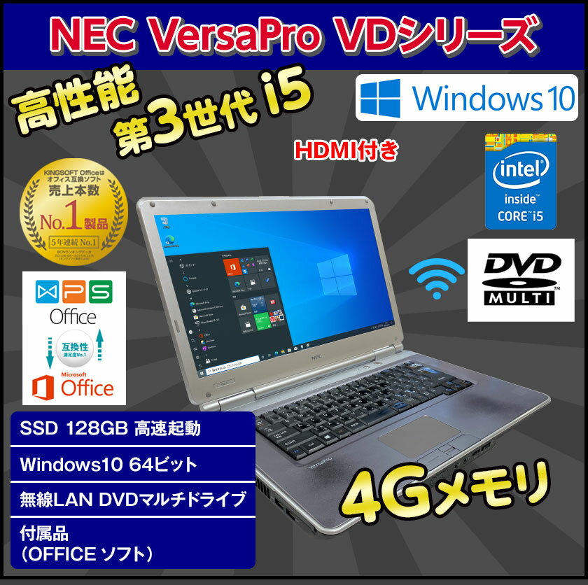 商品説明 メーカー NEC VersaProシリーズ CPU 第3世代 Core i5 メモリ 4GB HDD/SSD SSD 128GB 無線LAN 内蔵また新品小型USB無線LANアダプタ付属 ドライブ DVDマルチドライブ(CD・DVD再生&書込み) 液晶サイズ/最大解析度 15.6型ワイド液晶/(1366×768) ※画面が大きくて、目に優しくて、仕事もネット動画鑑賞にもおすすめ! インターフェイス LAN*1/USB3.0*2/USB2.0*3/PCカードスロット*1/マイク入力*1/ヘッドホン出力*1/HDMI出力*1/アナログRGB(D-Sub 15ピン)*1/D-sub9ピン*1/シリアルポート*1/音量調整スライド*1 操作OS Windows10 64ビット 付属品 パソコン本体/ACアダプター/KINGSOFTライセンスカード(オフィス) インストール済みソフト WPSOffice(KINGSOFTOffice)、Google Chrome ウェブブラウザ、DVD Player リカバリ形式 なし 附属バッデリー ※付属のバッテリーは消耗品のため保証対象外となります。